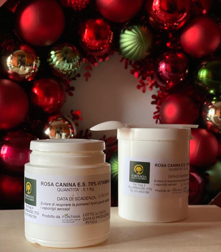 Presso la farmacia San Nazario di Villarbasse trovate l'estratto secco di rosa canina, ricchissimo di vitamina C (titolato al 70%), ma non solo, in quanto il prodotto naturale non contiene solo acido ascorbico ma tutto il fitoomplesso, ovvero tutti i i principi attivi che la natura ha voluto mettere nella rosa canina.